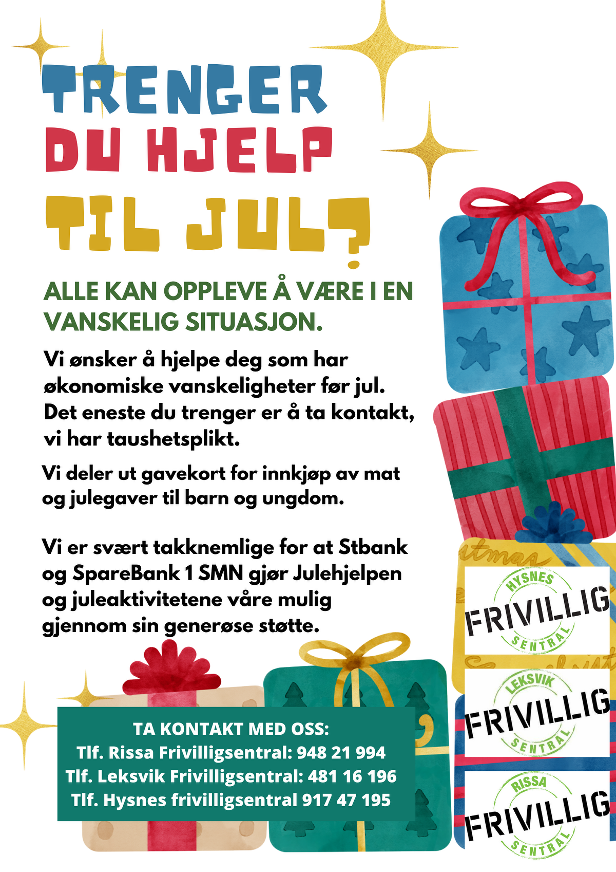 Trenger du hjelp til jul? Vi deler ut gavekort for innkjøp av mat og julegaver til barn og ungdom.Ta kontakt:
